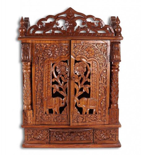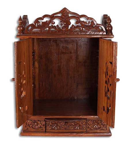 There is plywood use at the backside, at the base area and at the ceiling. At the base of the Mandir, there is a drawer placed along with a sliding tray. The drawer are beautifully and finely carved by our skilled artisans. The Mandir stood up at the flat base and best suitable for the home. Temple is made in teak wood along with teak ply. The best place to serve your deity at home.